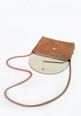 Cartera mediana con solapa forrada fijada con broche imán. Bajo la solapa cerrada con cierre metálico YKK. Correa cilíndrica rellena. Bolsillo Exterior tipo sobre para celular u otros pequeños accesorios.