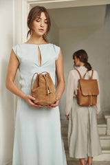 Su base redonda está fortalecida por forro de cuero en su interior. Está cerrada con cordón de cuero ajustable dándote la posibilidad de controlar cuanto llenarla.
