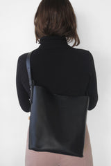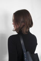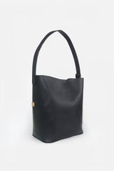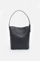 Bolso de cuero de base rígida que otorga estructura y lo mantiene erguido. Tiene dos bolsillos interiores tipo sobre para celular, llaves y otros pequeños accesorios. Con correa ajustable para llevar al hombro.
