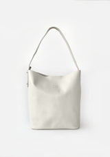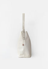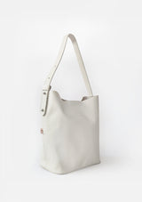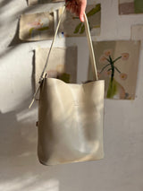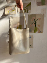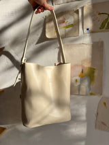 Bolso de cuero de base rígida que otorga estructura y lo mantiene erguido. Tiene dos bolsillos interiores tipo sobre para celular, llaves y otros pequeños accesorios. Con correa ajustable para llevar al hombro.